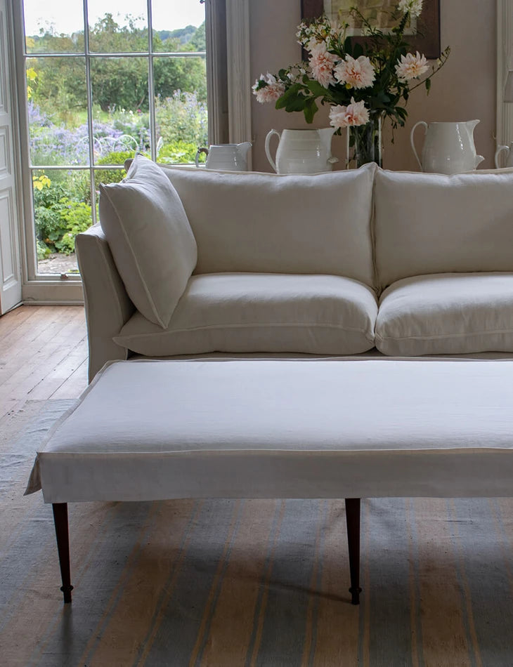 'Coffee tables designed for living in' Our coffee tables are designed to get a lot of use - they are large and generous to accommodate drinks books and games for families and friends. For that reason, all my coffee tables come with loose covers so they can be removed for cleaning. I wanted mine to be really easy to change so I have added a discrete fitting under the frame of the base that makes it super easy to change your covers. These are handmade in the UK and US by the same workshop that used to work with Sophie's father all those years ago. They have American Walnut legs and the top is upholstered with all natural materials. The upholstered base contains the following materials: wool, rubberised natural fibres including coconut and animal hair, cotton and hemp. The covers are removable and many of our fabrics are machine washable at home so you can change the look of your room very easily without buying a new piece of furniture. Many of our customers buy more than one cover.