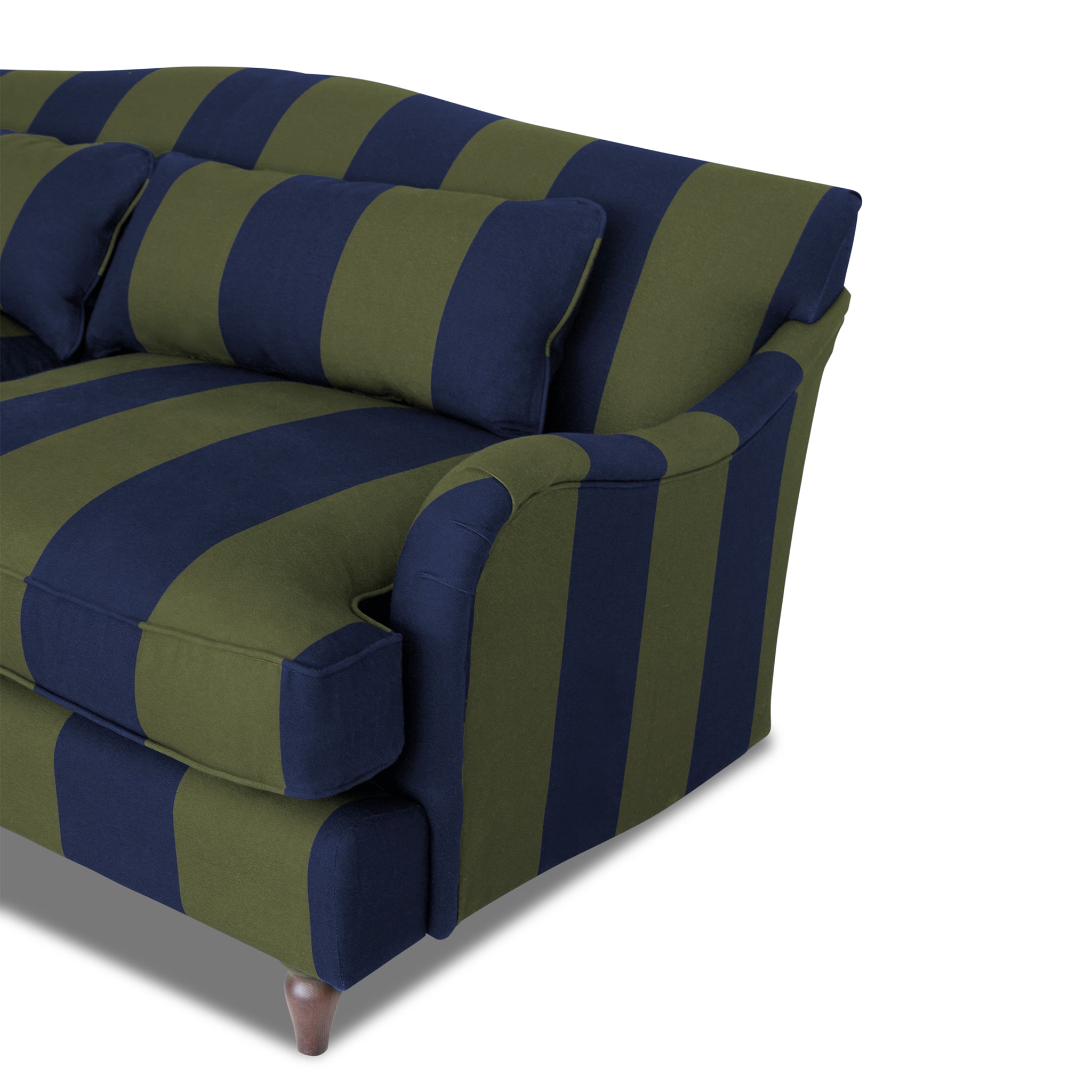 We’ve chosen our brand new Woodland Stripe fabric here – an organic yarn woven in the UK – which brings a natural, understated charm with its deep, earthy stripes. This fabric feels beautifully grounded, adding just the right amount of texture and colour without overwhelming the space.