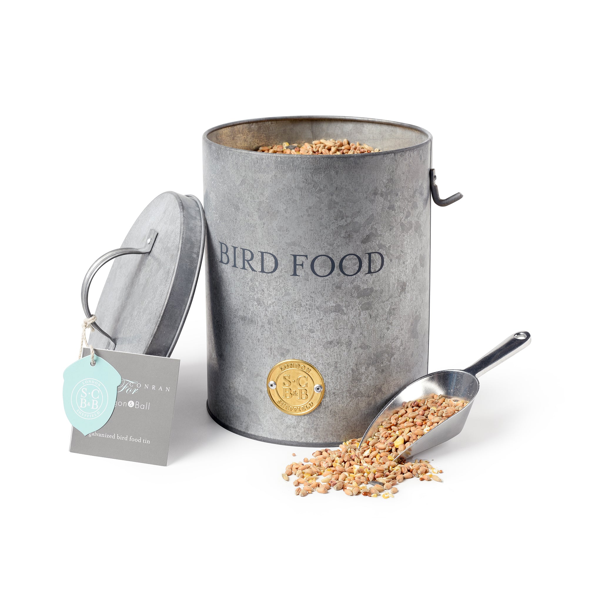 A galvanized pest proof tin to store your bird food with handy scoop - it fits neatly under your arm and stops spillages and mess.