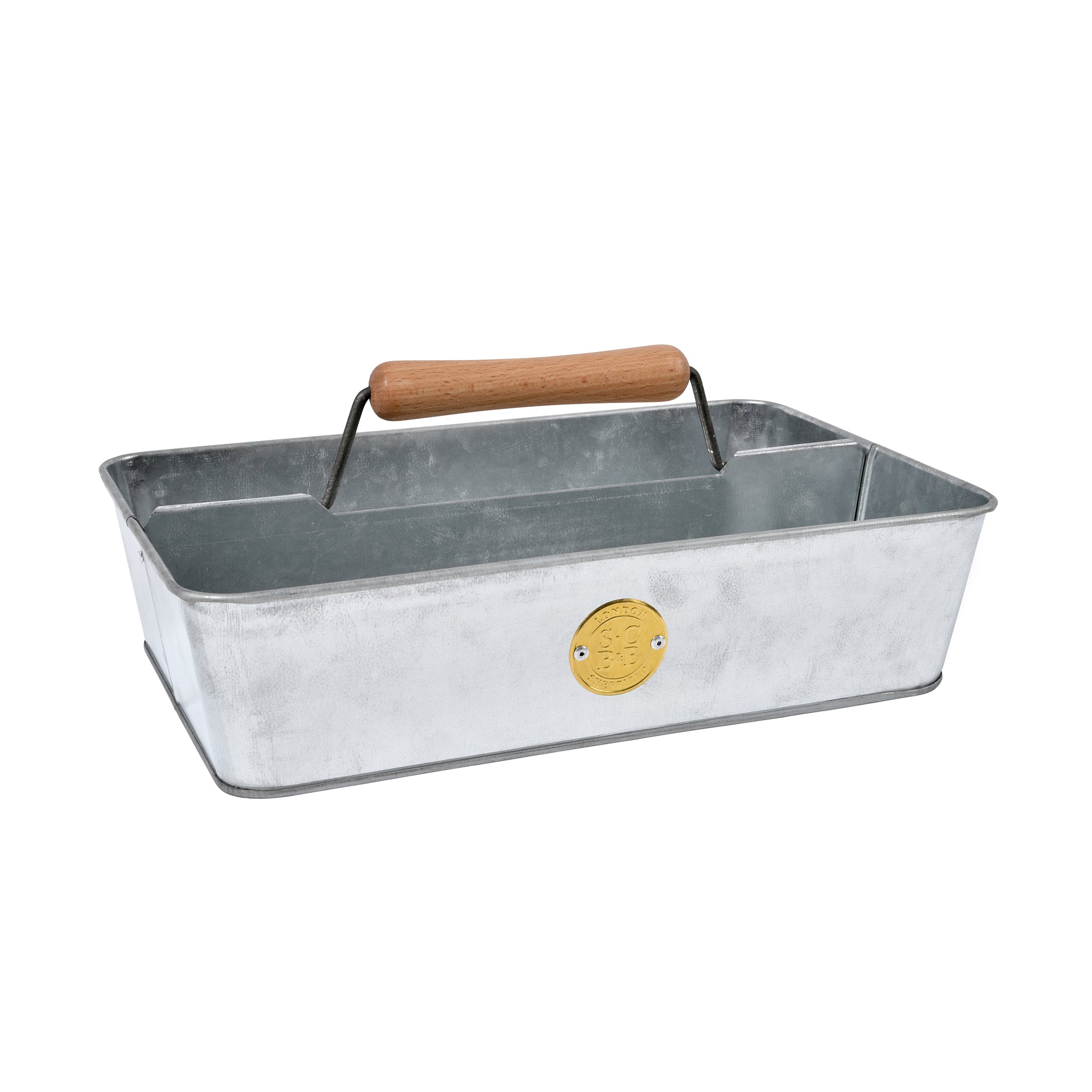 A stylish and practical garden trug in galvanized steel, ideal for holding tools, labels, twine and other gardener's essentials as you garden. The two roomy compartments give enough carrying capacity to house a good selection of essential tools, yet it's not so bulky that it makes storage a problem. Each trug is handmade and aged to give each piece its own character, with a comfortable wooden handle for easy carrying.