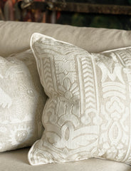 Discover the Totem Ivory Embroidered Cushion, crafted from our new Totem linen fabric, part of the Folklore collection. This elegant cushion features a detailed close-covered chain stitch design, inspired by the linear patterns of Totem Poles, symbolizing ancestry and cultural heritage. Finished with Medici Chalk piping, it adds a touch of timeless sophistication to any space.